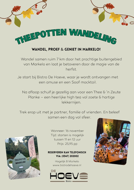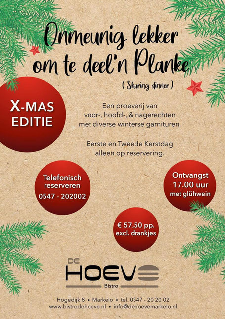 Welkom bij bistro de Hoeve in Markelo. Bij bistro de Hoeve kom je heerlijk tot rust na een mooie wandeling of fietstocht, geniet je van een gezellige High Tea en ben je uiteraard welkom voor een heerlijk diner. Onze gezellige bistro met terras is gevestigd direct aan de Hogedijk en biedt een warme en intieme sfeer.